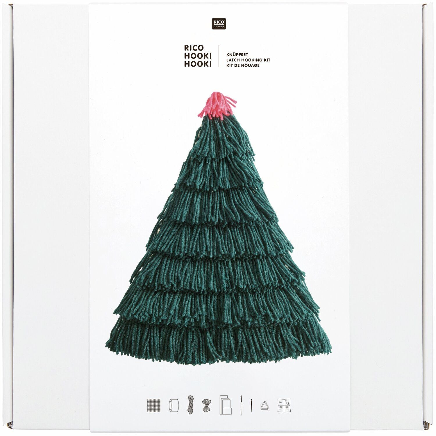 De Rico Hooki Hooki knooppakket "Kerstboom wandkleed" bevat stramien met een voorgetekend kerstboom motief. Het groene garen wordt met een sjabloon op maat geknipt om een driedimensionaal effect te creëren. Door verschillende garenlengtes ontstaan interessante texturen, terwijl het neonroze garen de top van de boom accentueert. Deze knoopsetset is geschikt voor een moderne kerstdecoratie.