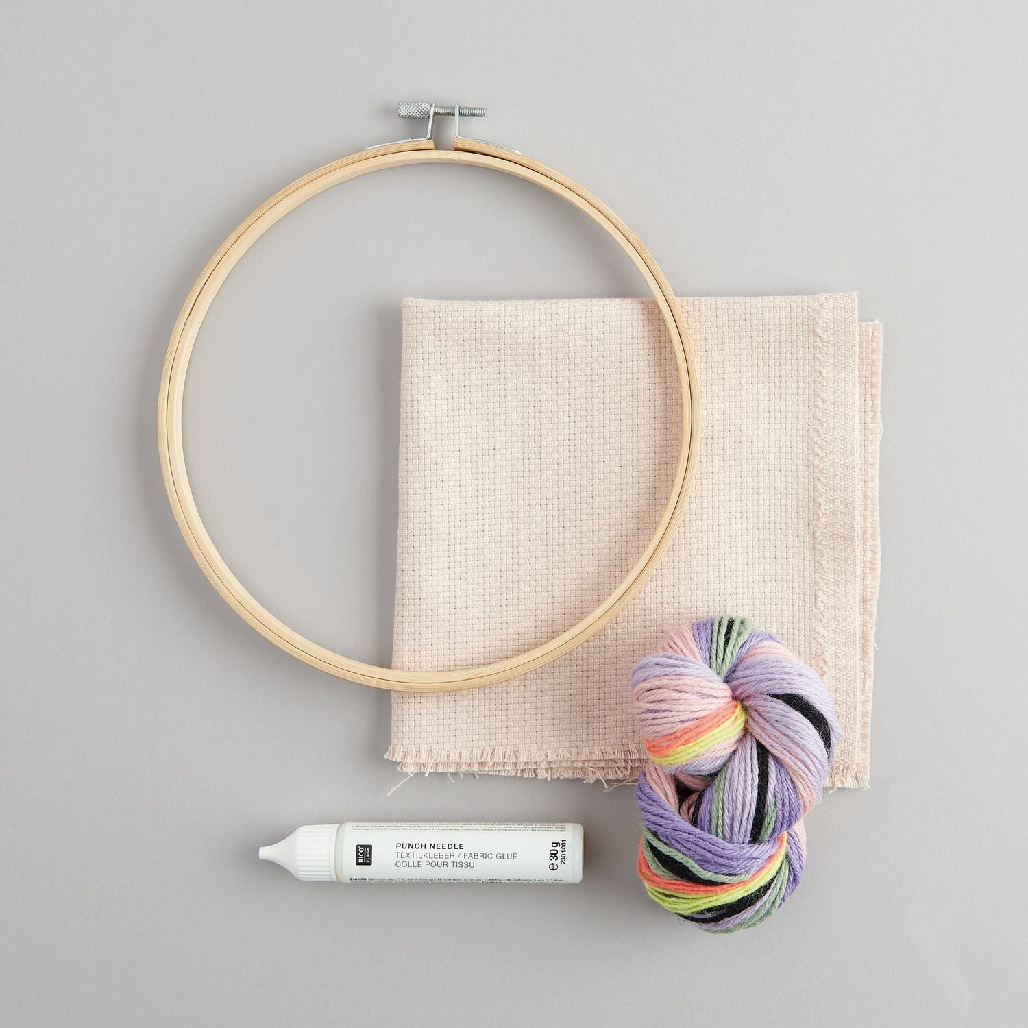 - Inhoud: Borduurring Ø 20 cm, monnikstof deel 35 x 35 cm 100% katoen, kilim wol 100% wol en kilim wol 75% polyacryl en 25% wol, Punch Needle textiellijm 30 g, instructies
