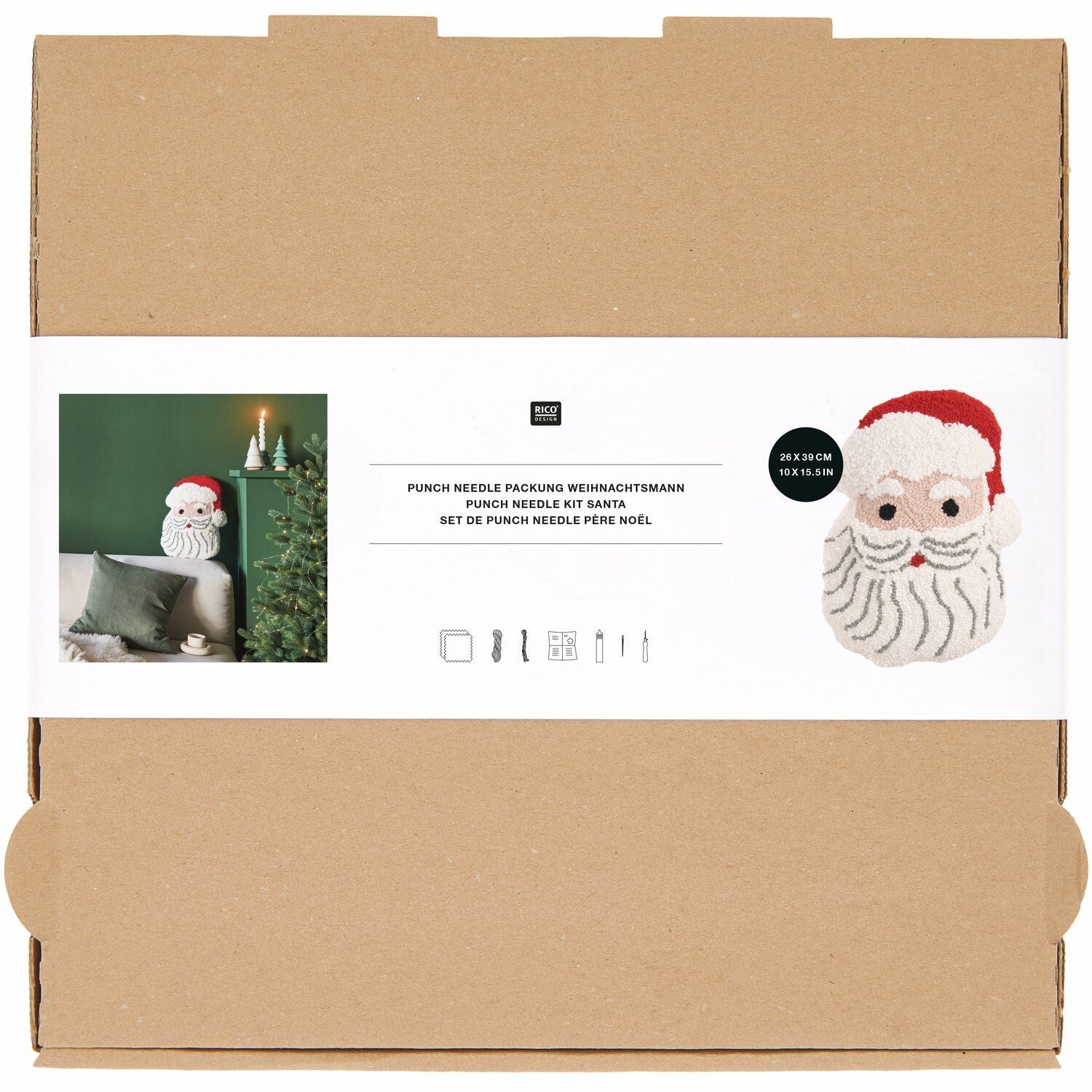 Het punch needle-pakket 'Kussen Santa' is een 12-delige set voor het maken van een kerstman-kussen. Het bevat een punch needle, stukken monniksstof, dik garen, textiellijm en een handleiding met tekenmal. Het afgewerkte kussen heeft een afmeting van ca. 26 x 39 cm en is ideaal voor kerstdecoraties.
